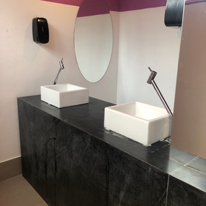 Outro desafio foi a área das pias. A bancada alta, com cuba de sobrepor e sem área para encaixe da cadeira faz a vida do cadeirante parecer com a de um contorcionista ao lavar a mão de lado. O dispenser de sabonete estava instalado em uma altura bem alta e de difícil acesso. Ponto negativo de toda a exposição ao meu ver.